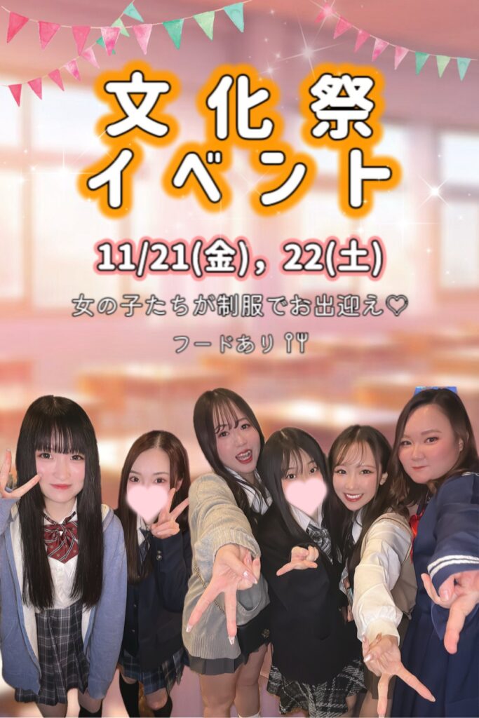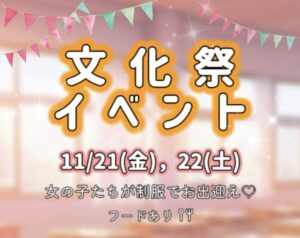 11/21(金)、22(土)は文化祭イベントをします! 女の子は制服でお出迎え✩.*˚ 当日は模擬店のようにフードを 用意しておりますので 是非会いに来てください( * . .)” ブログ この記事が気に入ったら フォローしてね! Follow Me 11月14日 11月16日 この記事を書いた人 staff 関連記事 12月7日 2025年12月7日 12月6日 2025年12月6日 12月5日 2025年12月5日 12月4日 2025年12月4日 12月2日 2025年12月2日 12月1日 2025年12月1日 12月営業カレンダー🗓 2025年12月1日 11月30日 2025年11月30日