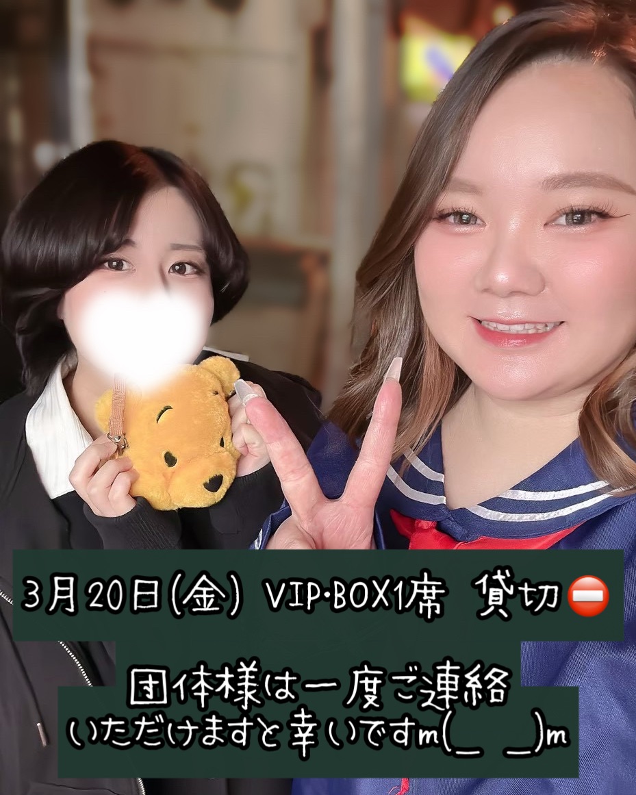 いつもご利用いただきありがとうございます💖 3月20日(金) VIP・BOX1席 貸切⛔ 団体様は一度ご連絡 いただけますと幸いですm(_ _)m よろしくお願いいたします💖 イベント情報 ブログ この記事が気に入ったら フォローしてね! Follow Me 3月19日 この記事を書いた人 staff 関連記事 3月19日 2026年3月20日 3月18日 2026年3月19日 4月5日(日) お花見イベント🌸 2026年3月18日 3月17日 2026年3月17日 3月16日 2026年3月16日 3月15日 2026年3月15日 3月14日 2026年3月14日 3月13日 2026年3月13日